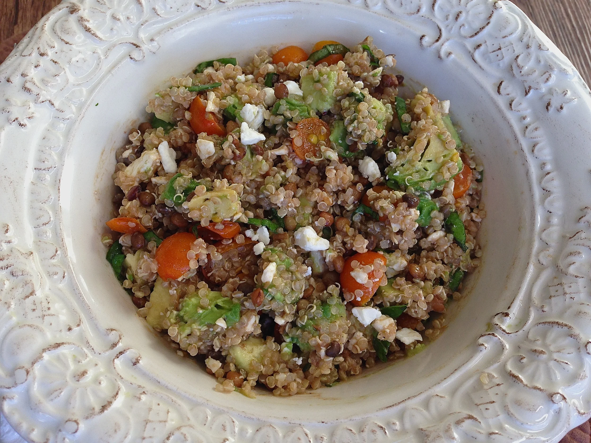 Meanwhile whisk garlic, the olive oil, vinegar, salt and pepper in a medium bowl. Top with tomatoes and basil and toss. Stir in cooled quinoa, lentils and feta until everything is nicely coated in dressing. Lastly, carefully fold in avocado cubes.
